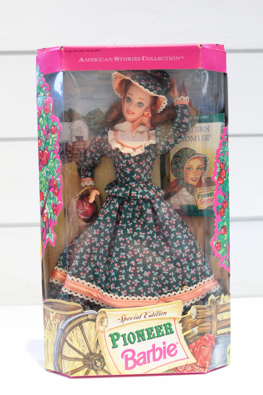 This is a Pioneer American Stories Special Edition Redhead Barbie Doll from 1994 by Mattel. Standing 12 inches tall, this Barbie doll features a gender-neutral design with varying eye color and complexion. It is made of vinyl and is part of the Barbie product line. The doll comes dressed in a characterful outfit and is a unique addition to any Barbie collection.
