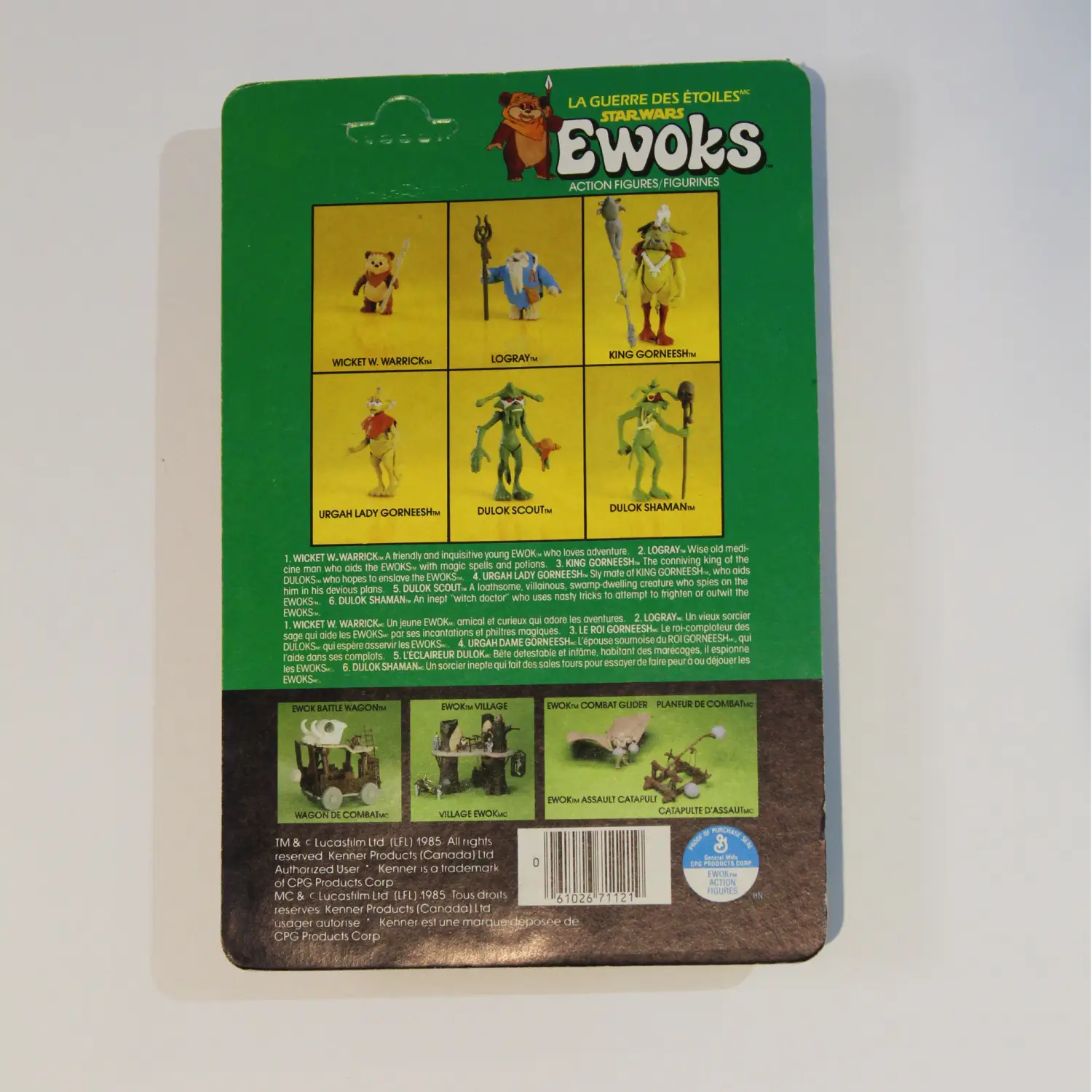 This is a vintage star wars Ewoks cartoon series set from 1985 features action figures including character King Gorneesh. the figures are in a 1:18 scale, made of plastic, and stand at 3.75 inches tall. this original Kenner set is part of the star wars franchise and is a must-have for collectors of vintage action figures. the packaging is unopened and in its original condition, bubble has yellowing, making it a rare find for fans of the Ewoks TV show and star wars movies.