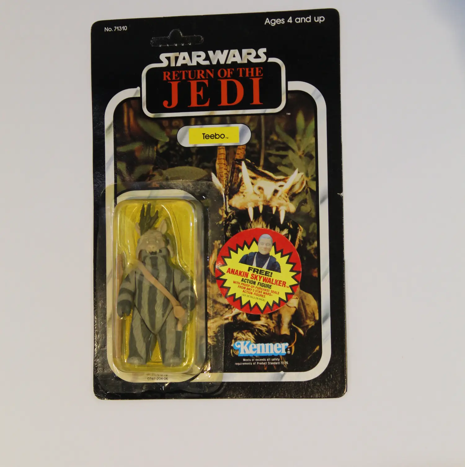 This is a vintage Kenner action figure from the star wars franchise. specifically, it is an Ewok warrior figure from the 1983 return of the jedi movie. the figure is made of plastic and was manufactured in Hong Kong during the 1980s. it is an original, licensed reproduction and is in grade 85+. the figure features the character Teebo and is in excellent condition, with all original accessories included. please inspect pictures closely for condition.